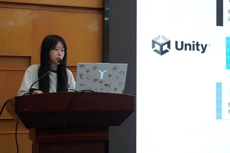Unity中国运营经理赵莹带来了关于《Unity游戏开发者全周期服务》的主题分享。她介绍了Unity作为全球领先的游戏开发引擎,为开发者提供的强大工具和完善的生态系统,并鼓励同学们掌握Unity技术,为功能游戏的开发打下坚实的基础。